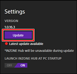 Klicken Sie auf das Zahnradsymbol, um den Bildschirm Settings (Einstellungen) aufzurufen, und klicken Sie dann auf Update (Aktualisieren), um die PC-App INZONE Hub auf die neueste Version zu aktualisieren.