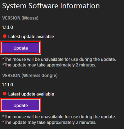 - Überprüfen Sie die Software-Version der Maus und des kabellosen Dongles. Wenn die Version als 1.1.1.0 angezeigt wird, können Sie mit dem Update fortfahren.