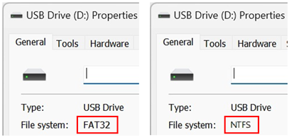 - Klicken Sie mit der rechten Maustaste auf das USB-Laufwerk und öffnen Sie Eigenschaften, um das Dateisystem zu prüfen.