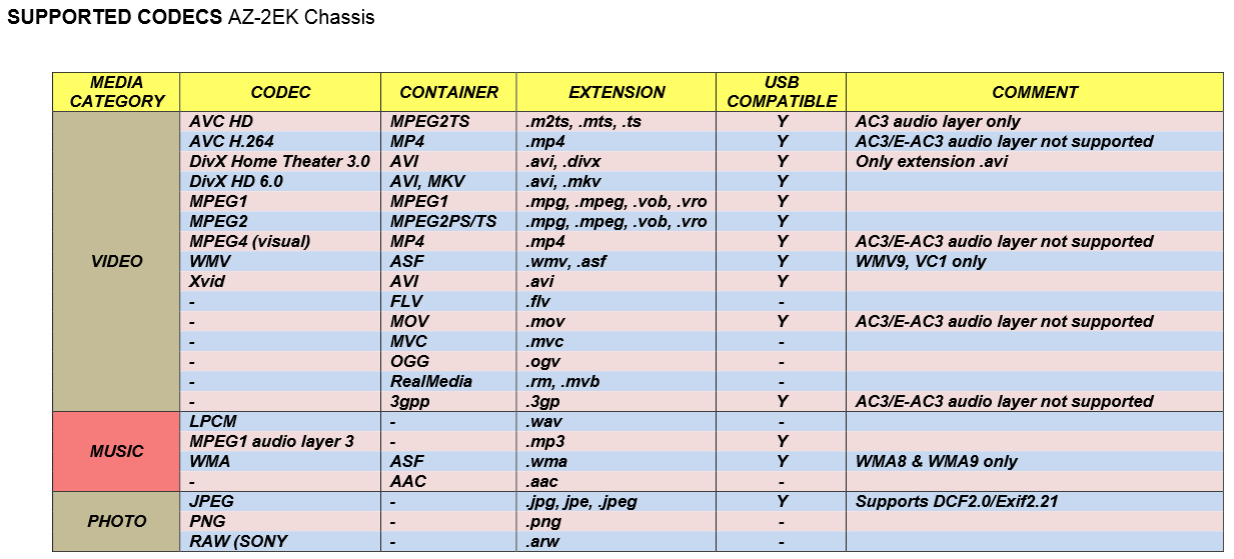 - Regardez dans la colonne Extension pour trouver tous les types de fichiers compatibles. La compatibilité s'applique à la fois à l'USB et au réseau à domicile, sauf indication contraire.
