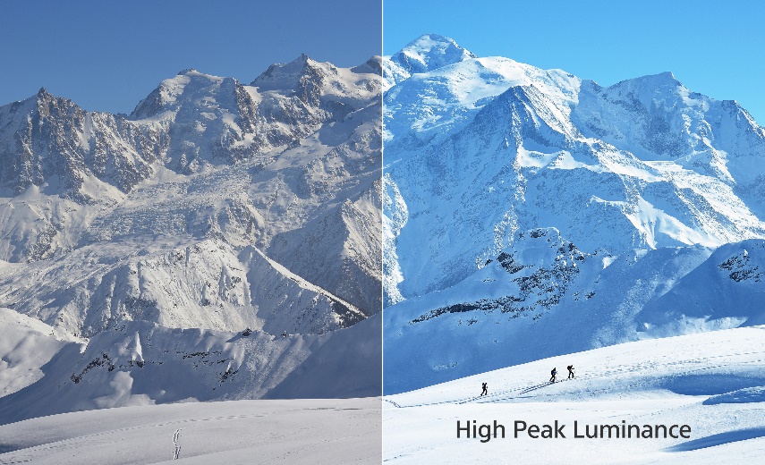 Pic de luminance élevé3 : Avec une luminance plus élevée que jamais, les TV extrêmement puissants peuvent reproduire fidèlement les scènes naturelles dans leurs moindres détails, y compris sous la plus intense lumière du jour, comme un paysage de montagne, brillamment éclairé et couvert de neige.