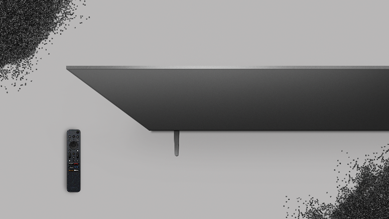 Du développement des matériaux au design extérieur, BRAVIA a réussi à améliorer significativement l’utilisation de matériaux recyclés tout en préservant une finition de qualité élevée. Le SORPLAS™18, un plastique recyclé développé par Sony, et utilisé pour le capot arrière19, qui représente la plus grande surface d’un téléviseur, et environ 65 %20 du total du plastique utilisé est en matériaux recyclés. La télécommande Eco Remote compacte et rechargeable est également faite de plastique recyclé à environ 80 %21.