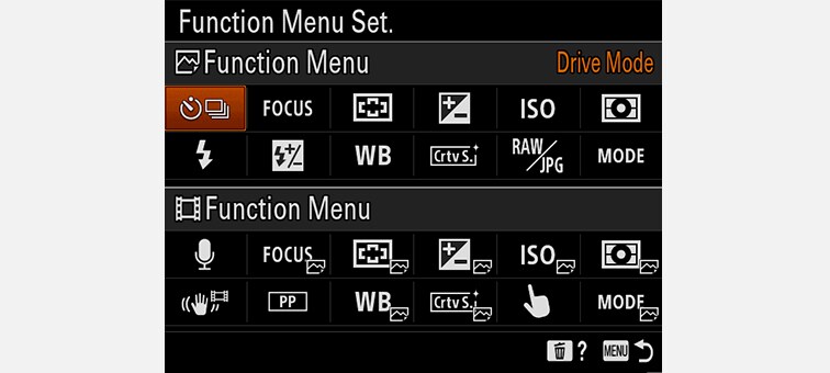 Funktionsmenüelemente können für Fotos und Filme unabhängig festgelegt werden und Hilfe-Displays sind auf dem Menübildschirm verfügbar. Die persönliche Menüfunktion ermöglicht das flexible Zuordnen von 30 Menüelementen. Häufig verwendete Funktionen können über die persönliche Drehradfunktion zudem dem Einstellrad und dem Drehrad zugewiesen werden.