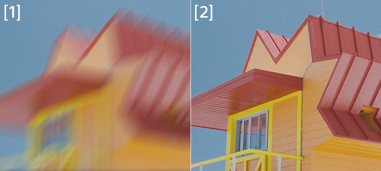 kürzeren Verschlusszeit entspricht. So können Verwacklungen der Kamera selbst bei handgeführten Teleaufnahmen oder schwierigen Lichtverhältnissen ausgeglichen werden. In Kombination mit dem ausgeklügelten optischen Design der Kamera und dem modernen Bildprozessor sorgt dies für eine beeindruckende Bildqualität. [1] Ohne optischen SteadyShot™ (simuliert) [2] Mit optischem SteadyShot