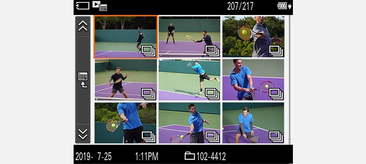 Im Wiedergabemodus können Sie Fotos bewerten oder vor dem Löschen schützen. Diese Funktionen lassen sich benutzerdefinierbaren Tasten zuordnen. Serienaufnahmen können als zusammengehörige Bildgruppen angezeigt und Gruppen von Aufnahmen mit nur einem Vorgang gelöscht oder geschützt werden. Zudem stehen jetzt vier Serienaufnahme-Anzeigeoptionen für den Sucher oder das LC-Display zur Verfügung.